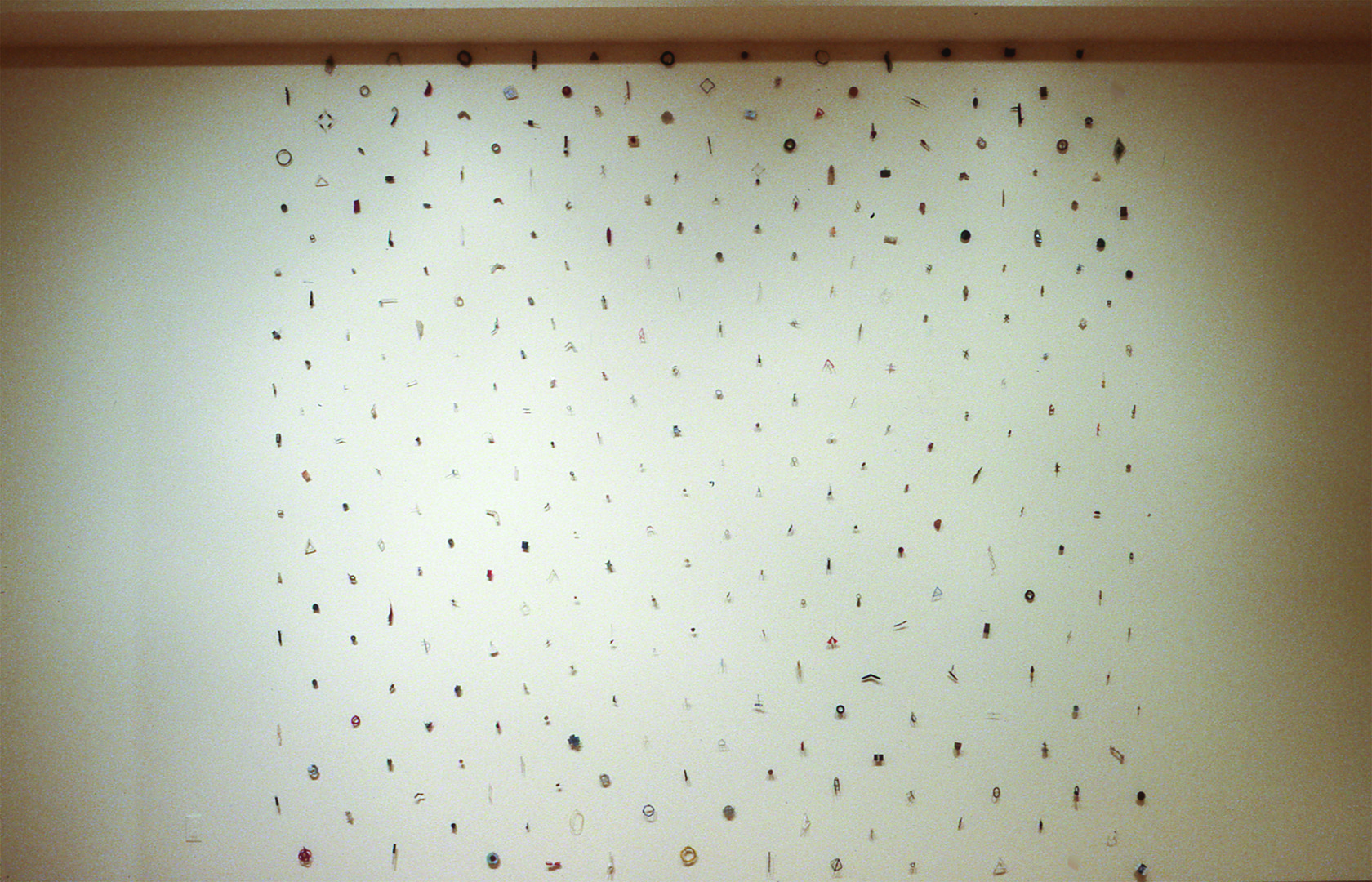 Donald Lipski has been called one of America’s most interesting and eccentric sculptors. As an example, an art critic pointed to one of Lipski’s best-known works, Gathering Dust, a huge wall piece that consists of hundreds of tiny objects – stray materials like matches, rubber bands and nails – that when grouped seemed to present an unnerving portrait of insects impaled on a gallery wall. This work, along with many other Lipski sculptures now on display at the JCCC Gallery of Art, is both humorous and deadly serious in its intent.