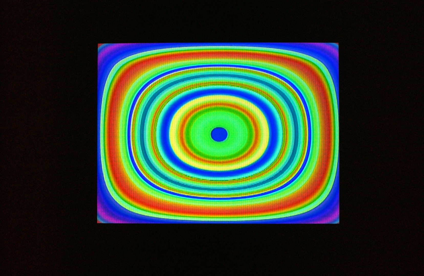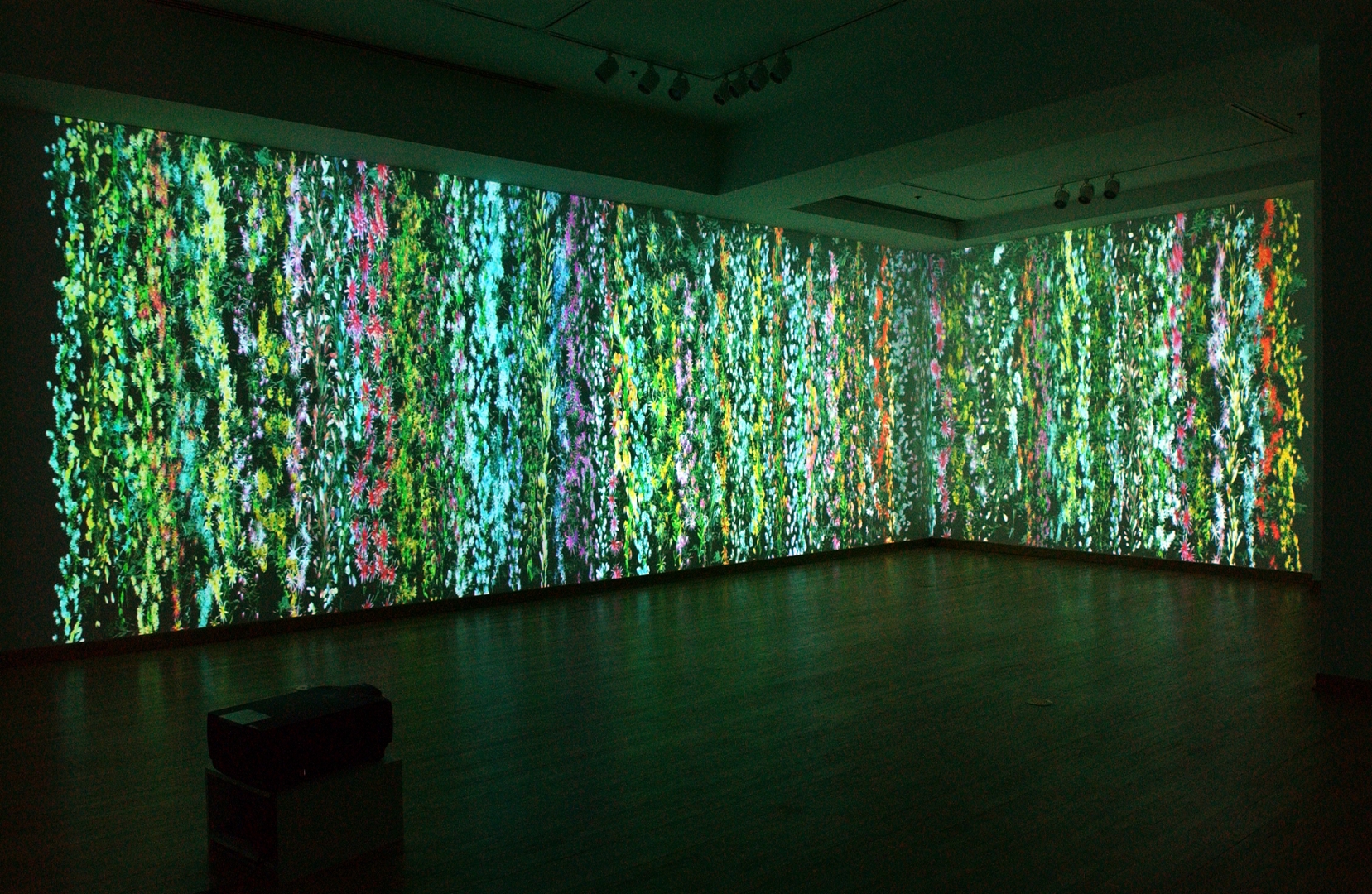 The Gallery of Art at Johnson County Community College will present two video installations, Jimmy Carter and Glimpse, by Los Angeles-based artist Jennifer Steinkamp. Steinkamp’s Glimpse is a projection piece of brightly colored concentric ovals that pulsate outward from the center, a hypnotic composition. Her Jimmy Carter utilizes computer animation to create an immersive, interactive projection installation. Jimmy Carter consists of two walls that are covered with projected images of thousands of flowers, which Steinkamp designed on a computer. The artificial asters, chrysanthemums, lilies, orchids and tulips are placed along vertical curves that move with turbulence, creating a striped pattern.