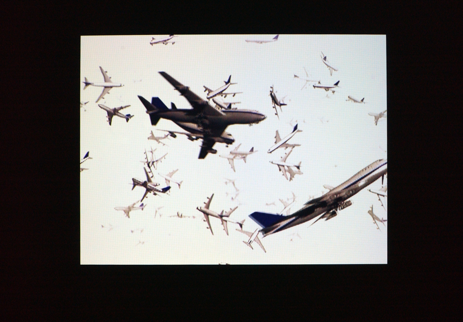 Guy Hundere’s Ornithomancy, 2003, is a video animation of a sky filled with Taschen 747 airplanes. Hundere has transformed the slow moving, cumbersome object into an agile craft, which flies through the skies in patterns based on twin algorithms derived from physics and animal behavior models. The acrobatic movements of the planes recall the fluid motions of swimming fish or birds in flight. Ornithomancy, the practice of augury, is an ancient method of divination that interprets the flight patterns of birds. The term "augury" properly refers to the practice of the Greeks and Romans to foretell future events by the observation and interpretation of the flights, chattering or singing of birds.