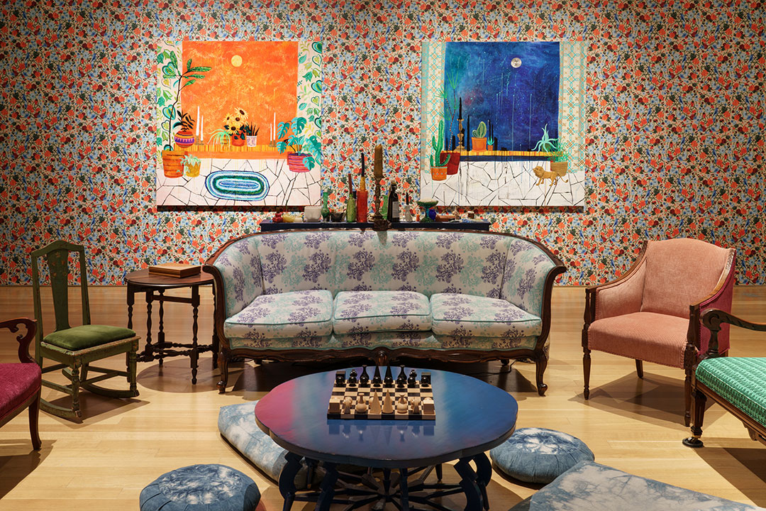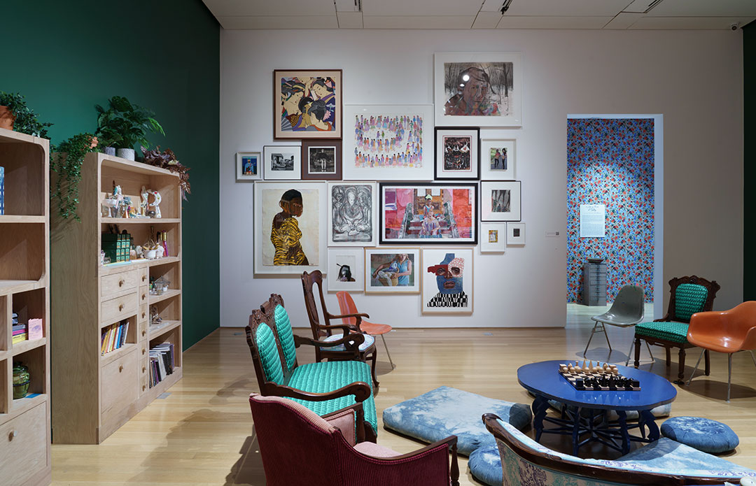 Guests are invited to immerse themselves in the space and use it as an outlet for thought and conversations. There are themes and prompts embedded in every aspect of the room’s design, from the custom wallpaper and upholstered furniture to the thematically curated curiosity cabinets densely packed with art objects, books, and ephemera. As a viewer, you are invited to open drawers, read, write, draw, sit, spend time with yourself and your thoughts, or with others sharing the space with you. This is a space meant to be used, not just observed.